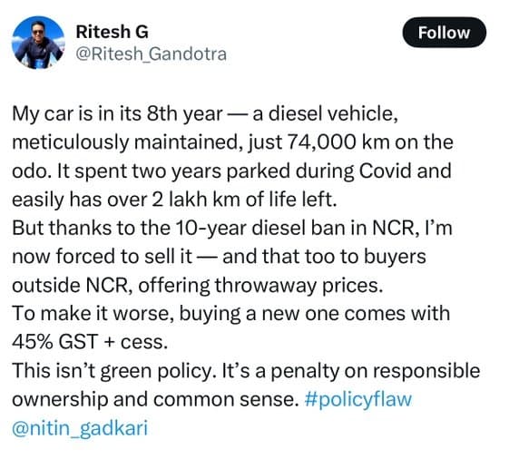उन्होंने सोशल मीडिया पर लिखा, “यह कोई ग्रीन पॉलिसी नहीं है, बल्कि जिम्मेदार ओनरशिप और कॉमन सेंस पर पेनल्टी है.” उन्होंने यह भी बताया कि अगर वे इसी सेगमेंट की नई गाड़ी खरीदते हैं, तो उन्हें 45%GST और सेस देना होगा, जिससे नई गाड़ी खरीदना और भी महंगा हो जाता है.