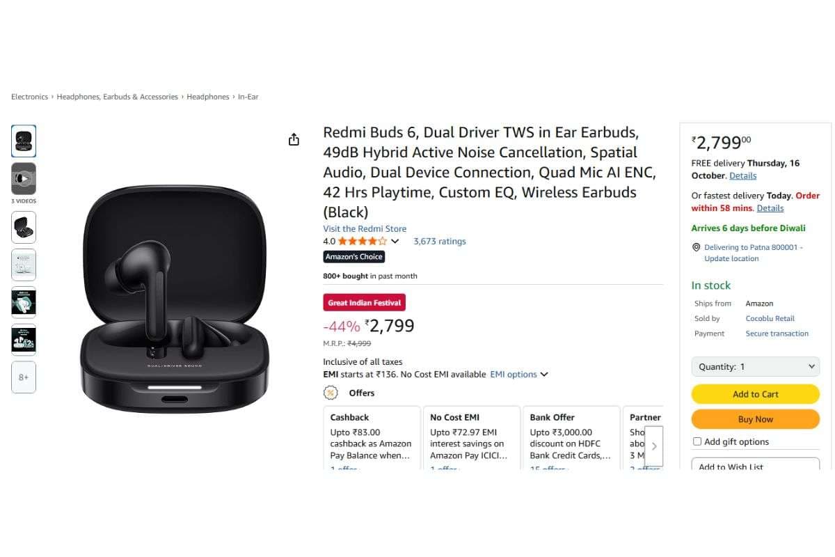 Redmi Buds 6 आपको साउंड, फीचर्स और बिल्ड क्वालिटी का परफेक्ट बैलेंस देते है, जो डेली यूज में काफी काम का है. इन ईयरबड्स में हाइब्रिड ANC और इंटेलिजेंट नॉइज रिडक्शन जैसे फीचर्स मिलते हैं. इनका फायदा यह है कि कॉल या म्यूजिक सुनते समय आवाज एकदम क्लियर मिलती है. इसके अलावा, आपको इसमें 42 घंटे की बैटरी लाइफ मिलती है यानी ये लंबे समय तक आराम से चलते हैं. अमेजन पर फिलहाल इसकी कीमत 2,799 रुपये है.