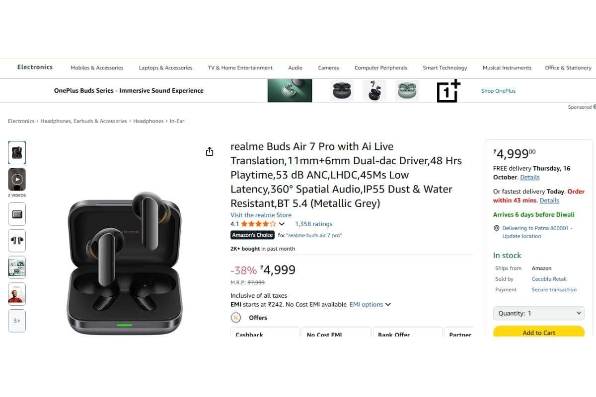 Realme Buds Air 7 Pro भी एक किफायती और बढ़िया ऑप्शन है. इसका फिटिंग काफी आरामदायक है और इसमें आपको IP55 वॉटर रेजिस्टेंस भी मिलता है, जिससे इसे वर्कआउट या रोजमर्रा के यूज के लिए एकदम बेहतर है. 48 घंटे तक की बैटरी लाइफ और दमदार नॉइज कैंसलेशन फीचर के साथ, ये ईयरबड्स उन यूजर्स के लिए परफेक्ट हैं जो लंबी बैटरी और प्रीमियम फीचर्स चाहते हैं. फिलहाल अमेजन पर इसे सिर्फ 4,999 रुपये में खरीद सकते हैं.