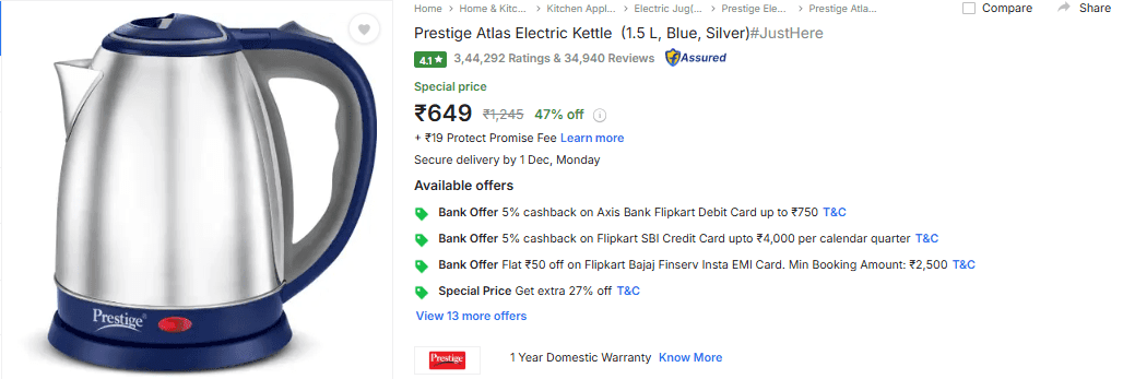 फ्लिपकार्ट पर Prestige के Atlas Electric Kettle पर 48% तक का डिस्काउंट मिल रहा है. ऐसे में आप इस केटल को 1,245 रुपये की जगह सिर्फ 649 रुपये में खरीद सकते हैं. यह केटल 1.5 लीटर कैपेसिटी वाला है, जो 4 से 5 लोगों के लिए मिनटों में पानी उबाल सकता है. इसमें आपको पावर इंडिकेटर के साथ-साथ ऑटो शट ऑफ का फीचर मिलेगा. इसका पावर कंजम्पशन 1000W का है. साथ ही इस प्रोडक्ट पर आपको 1 साल की वारंटी भी मिलेगी.