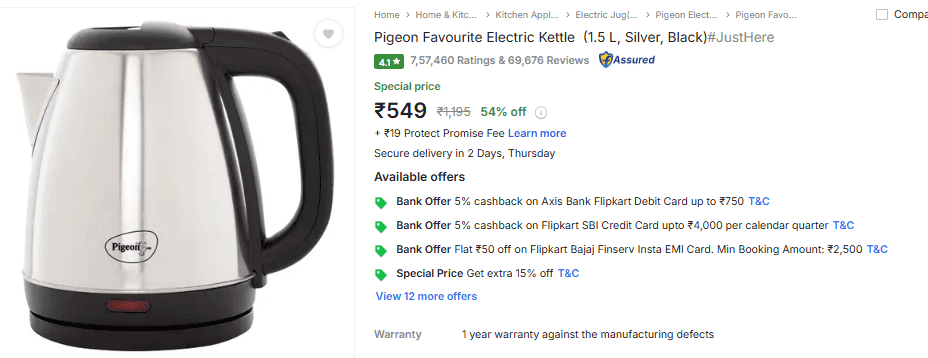 Pigeon के 1.5 लीटर कैपेसिटी वाले इलेक्ट्रिक केटल पर फ्लिपकार्ट 54% तक की छूट दे रहा है, जिससे इस केटल की कीमत 1,195 रुपये से कम होकर 549 रुपये हो गई है. Pigeon के इस इलेक्ट्रिक केटल में आपको पावर इंडिकेटर और ऑटो स्विच ऑफ जैसे फीचर्स मिलेंगे. इस केटल में आप आराम से 4 से 5 लोगों के लिए पानी उबाल सकते हैं. 1300W पावर कंजम्पशन वाले इस केटल में आपको 1 साल की वारंटी भी मिलेगी.