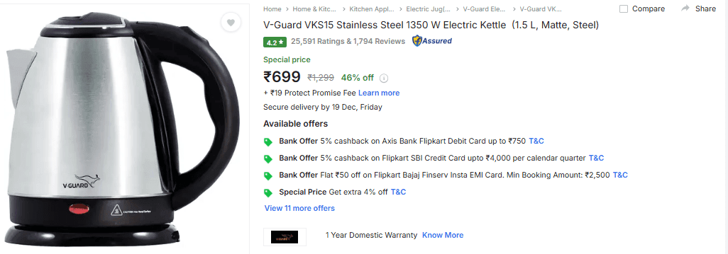 फ्लिपकार्ट पर V-Guard के 1.5 लीटर कैपेसिटी वाले इलेक्ट्रिक केटल पर 46% तक की छूट मिल रही है, जिससे इस केटल को आप 699 रुपये में खरीद सकते हैं. 1350W पावर कंजम्पशन वाले इस केटल में आपको ऑटो कट-ऑफ और पावर इंडिकेटर जैसे फीचर्स मिलेंगे. इस प्रोडक्ट पर भी 1 साल की वारंटी मिलेगी.