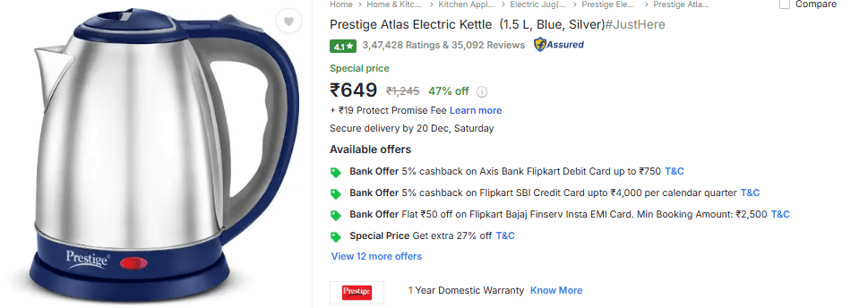 Prestige Atlas के 1.5 लीटर कैपेसिटी वाले इलेक्ट्रिक केटल पर 47% तक की छूट मिलेगी. डिस्काउंट के बाद इस केटल की कीमत 649 रुपये हो गई है. इसमें भी पावर इंडिकेटर और ऑटो शट ऑफ का फीचर मिलेगा. इसका पावर कंजम्पशन 1000W का है. साथ ही इस प्रोडक्ट पर आपको 1 साल की वारंटी भी मिलेगी.