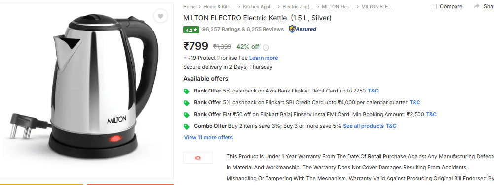 Milton Go के 1.5 लीटर कैपेसिटी वाले इलेक्ट्रिक केटल पर फ्लिपकार्ट 43% तक की छूट दे रहा है. डिस्काउंट के बाद इस केटल की कीमत 1,399 रुपये से कम होकर 799 रुपये हो गई है. इस केटल में भी ऑटो स्विच ऑफ और पावर इंडिकेटर जैसे फीचर्स मिलेंगे. इसका पावर कंजम्पशन 1500W का है. साथ ही इस प्रोडक्ट पर भी 1 साल की वारंटी मिलेगी.