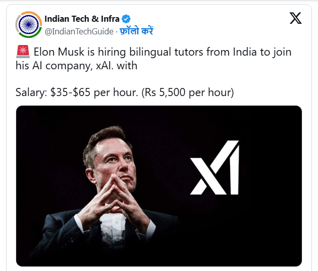 xAI Job: सोशल नेटवर्क X (पूर्व ट्विटर) के मालिक एलन मस्क की आर्टिफिशियल इंटेलीजेंस कंपनी xAI भारत से द्विभाषी ट्यूटरों की भर्ती कर रही है. कंपनी ने हिंदी और अंग्रेजी के जानकार ट्यूटरों को प्रति घंटे 35-65 डॉलर (लगभग 5,500 रुपये) वेतन देने का प्रस्ताव दिया है.
