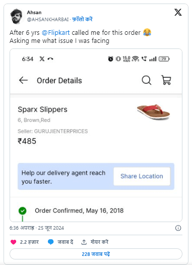 मुंबई में रहनेवाले एहसान खरबाई नाम के इस शख्स को ई-कॉमर्स वेबसाइट फ्लिपकार्ट के कस्टमर केयर से उस ऑर्डर के लिए एक कॉल आया, जो उसने 6 साल पहले प्लेस किया था. एहसान ने सोशल मीडिया प्लैटफाॅर्म एक्स पर एक स्क्रीनशॉट शेयर करते हुए यह बात कही. इस स्क्रीनशॉट में 16 मई 2018 का एक ऑर्डर देखा जा सकता है, जिसमें कस्टमर ने हवाई चप्पल मंगायी थी. उसके अगले दिन 19 मई 2018 को ऑर्डर शिप हो जाता है और उसका स्टेटस ‘ऑउट फॉर डिलीवरी’ यानी ऑर्डर डिलीवरी के लिए निकला दिखाई दे रहा है. वहीं, स्क्रीनशॉट में भी ऑर्डर डिलीवरी की एक्सपेक्टेड डेट 20 मई 2018 दिखाई दे रही है.