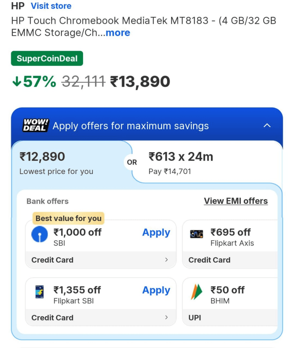 Flipkart Buy Buy Sale में HP Touch Chromebook पर जबरदस्त डील मिल रही है. इस सेल में आप बैंक डिस्काउंट के साथ इस लैपटॉप को सिर्फ 12,890 रुपये में खरीद सकते हैं. चेक करिए ऑफर डिटेल्स.