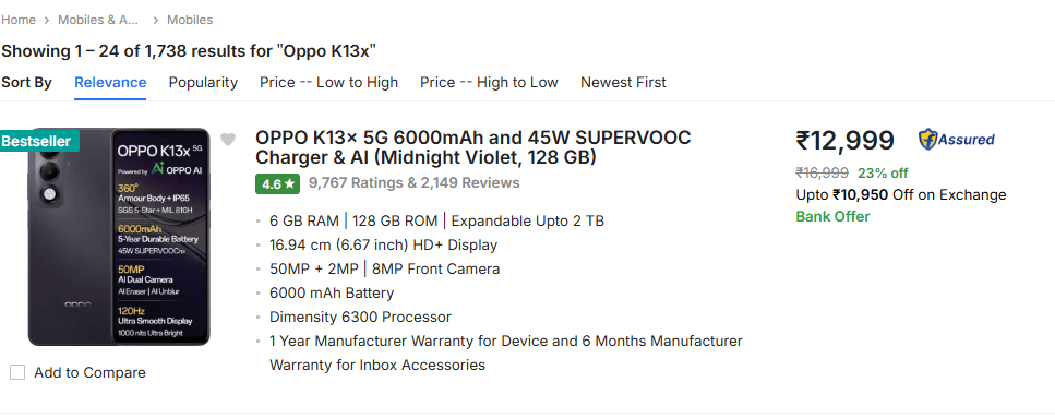 रही बात 49 रुपये में इस फोन को खरीदने कि तो फ्लिपकार्ट इस मॉडल पर 10,950 रुपये का एक्सचेंज ऑफर दे रहा है. जिससे आप अपने पुराने मॉडल को एक्सचेंज कर Oppo K13x 5G को बैंक और एक्सचेंज ऑफर के साथ इसे सिर्फ 49 रुपये में खरीद सकते हैं. हालांकि, ध्यान रहे एक्सचेंज ऑफर का फायदा आपको तभी मिलेगा जब आपके पुराने फोन की कंडीशन अच्छी होगी. क्योंकि, एक्सचेंज वैल्यू आपके पुराने फोन की कंडीशन और आपके फोन के मॉडल पर ही निर्भर करती है. जितना अच्छा फोन उतना अच्छा एक्सचेंज ऑफर.