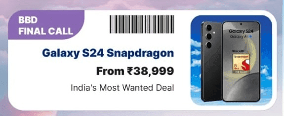 Samsung Galaxy S24 पर भी अच्छी-खासी छूट के साथ लिस्टेड है. BBD फाइनल कॉल में इस मॉडल के बेस वेरिएंट 8GB+128GB पर 47% तक का डिस्काउंट मिल रहा है. जिससे आप इस मॉडल को 74,999 रुपये की जगह बैंक डिस्काउंट के साथ 38,999 रुपये में खरीद सकते हैं.