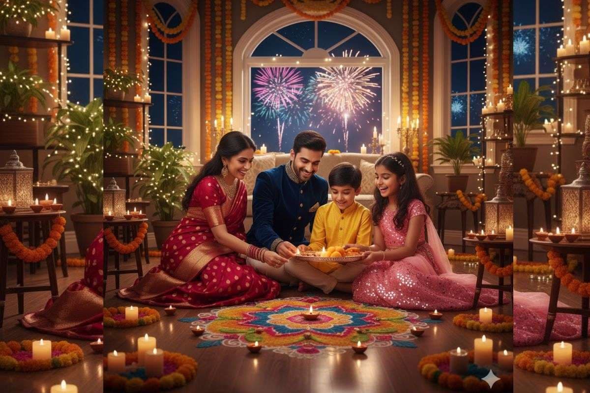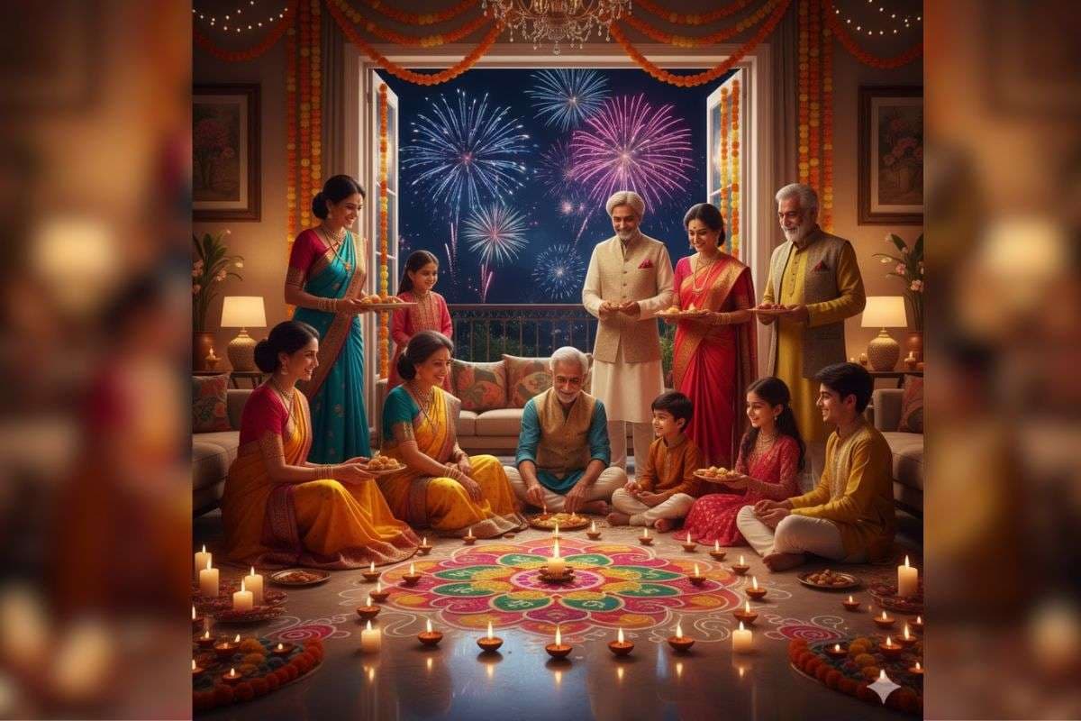 A happy Indian family celebrating Diwali together at home in which grand parents, parents and children dressed in traditional Indian attire (saree, kurta, sherwani), lighting diyas and candles around a colorful rangoli, exchanging sweets, warm golden lights glowing, beautifully decorated home with marigold flowers and fairy lights, background with fireworks in the night sky, joyful smiles, cinematic lighting, ultra-realistic, festive atmosphere.