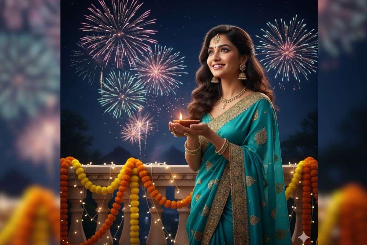 Create an AI image in which A beautiful young Indian woman holding a glowing diya in her hands and starring the starry sky full of fireworks standing near a decorated balcony on Diwali night. She wears a bright turquoise saree with golden embroidery, casting soft light on her smiling face and sparkling jewellery. Her hair is styled in soft curls, and a delicate maang tikka rests on her forehead. The terrace has marigolds and fairy-light decorations, and faint fireworks are visible in the night sky.
