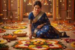 A happy Indian family celebrating Diwali together at home in which grand parents, parents and children dressed in traditional Indian attire (saree, kurta, sherwani), lighting diyas and candles around a colorful rangoli, exchanging sweets, warm golden lights glowing, beautifully decorated home with marigold flowers and fairy lights, background with fireworks in the night sky, joyful smiles, cinematic lighting, ultra-realistic, festive atmosphere.