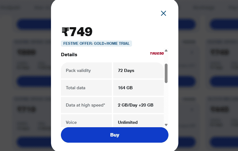 72 दिनों वाले प्लान में जियो यूजर्स को हर दिन 2GB हाई-स्पीड डेटा दे रही है. यानी की 72 दिन के हिसाब से टोटल 144GB डेटा. लेकिन खास बात यह है कि कंपनी इस प्लान में यूजर्स को 20GB एक्स्ट्रा डेटा भी फ्री दे रही है. जिससे यूजर्स को 72 दिनों के लिए टोटल 164GB डेटा का फायदा मिलेगा. वहीं, अगर आप 5G यूजर हैं, तो फिर आपको अनलिमिटेड डेटा का फायदा मिलेगा. इस प्लान की कीमत 749 रुपये है.