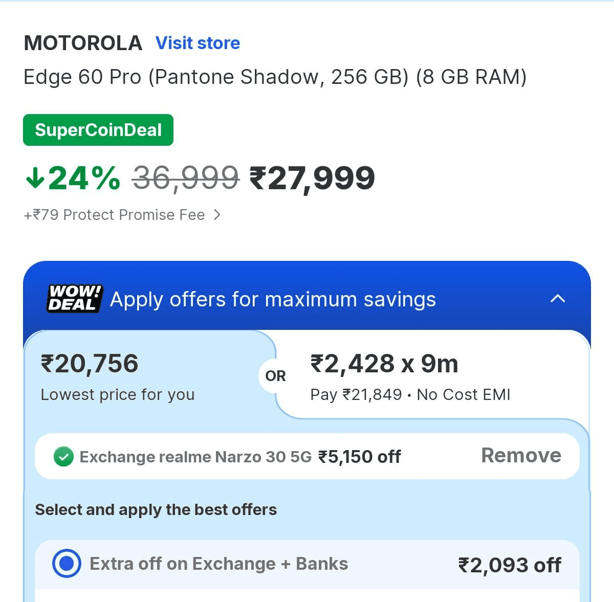 ई-कॉमर्स शॉपिंग साइट Flipkart पर Moto Edge 60 Pro के 8GB+256GB की कीमत 27,999 रुपये है, लेकिन फ्लिपकार्ट इस पर बढ़िया एक्सचेंज ऑफर दे रही है. जिससे आप अपने पुराने फोन को एक्सचेंज कर मोटोरोला का ये फ्लैगशिप मॉडल सस्ते में खरीद सकते हैं. जैसे कि मान लीजिए, आपके पास Realme का Narzo 30 5G का पुराना मॉडला है और इसकी कंडीशन अच्छी है. ऐसे में इस फोन को एक्सचेंज करने पर आपको फ्लिपकार्ट 5,150 रुपये का एक्सचेंज वैल्यू देगी. इतना ही नहीं, आपको 2,093 रुपये एक्स्ट्रा एक्सचेंज + बोनस ऑफर भी मिलेगा. यानी कि आपको टोटल 7,243 रुपये का एक्सचेंज ऑफर मिलेगा, जिससे आप Moto Edge 60 Pro को सिर्फ 20,756 रुपये में खरीद सकते हैं. ऐसे में 21 हजार रुपये से कम में आपके पास अच्छा डिस्प्ले, बढ़िया कैमरा और प्रोसेसर वाला फोन होगा.