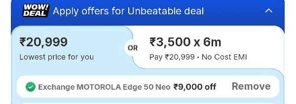 जैसे कि मान लीजिए आपके पास Motorola Edge 50 Neo है और उसकी कंडीशन अच्छी है. ऐसे में आपको फ्लिपकार्ट 9000 रुपये तक का एक्सचेंज ऑफर मिलेगा. जिससे 1000 रुपये के बैंक डिस्काउंट और 9000 रुपये के एक्सचेंज ऑफर के साथ आप Samsung Galaxy S24 FE 5G को 20,999 रुपये में खरीद सकते हैं. वहीं, अगर आपके पुराने स्मार्टफोन की कंडीशन एवरेज है और मॉडल भी थोड़ा पुराना है, तो हो सकता है कि एक्सचेंज वैल्यू कम मिले.
