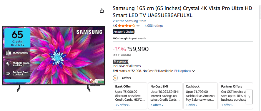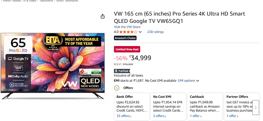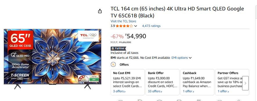बड़ी स्क्रीन पर बड़ी बचत, 65 इंच Smart TV पर पाएं 67% तक की छूट, सस्ते में घर को बनाएं थिएटर
