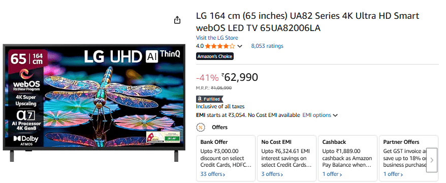 LG के 65 इंच स्मार्ट टीवी पर अमेजन 41% तक की छूट दे रहा है, जिससे आप इस टीवी को 62,990 रुपये में खरीद सकते हैं. LG का 65-इंच UA82 Series 4K Ultra HD Smart webOS LED TV एक बड़ी और बेहद डिटेल्ड स्क्रीन और रेस्पॉन्सिव α7 AI 4K प्रोसेसर के साथ आता है. HDR10 सपोर्ट के साथ इसके कलर्स बेहद रियलिस्टिक लगते हैं और डार्क सीन में गहरा, असली कॉन्ट्रास्ट देखने को मिलता है. साउंड की बात करें, तो इसमें मौजूद 20W Dolby Atmos आउटपुट आपको मूवीज, स्पोर्ट्स और वेब सीरीज के लिए क्लियर, दमदार और थिएटर जैसा ऑडियो एक्सपीरियंस देगा. इसमें स्मूद webOS इंटरफेस, इनबिल्ट वॉयस कंट्रोल और गेमिंग के लिए लो-लेटेंसी मोड जैसे ऑप्शंस मिलते हैं, जो इसे और भी स्मार्ट बनाते हैं. आप HDMI, USB, Wi-Fi या Bluetooth से कनेक्ट कर आसानी से ऐप्स और OTT प्लेटफॉर्म्स देखने का भी मजा उठा सकते हैं.