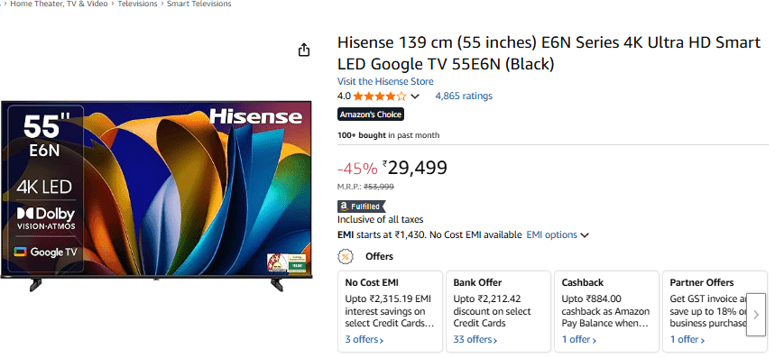Amazon पर Hisense के 55 इंच LED स्मार्ट टीवी पर 45% तक की छूट मिल रही है, जिससे इस टीवी की कीमत 53,999 रुपये से कम होकर सीधे 29,499 रुपये हो गई है. इस स्मार्ट टीवी में आपको 60Hz रिफ्रेश रेट सपोर्ट के साथ 4K रेजोल्यूशन वाला डिस्प्ले मिलेगा. इसमें आपको Dolby Atmos के साथ 24W का साउंड आउटपुट मिलेगा. यह गूगल टीवी है, जिसमें आपको Google Assistant के साथ-साथ Netflix, Youtube, Prime Video, Hotstar, Sony LIV, Zee5 जैसे ऐप्स का सपोर्ट मिलेगा. इस टीवी पर आपको 1 साल की वारंटी भी मिलेगी.
