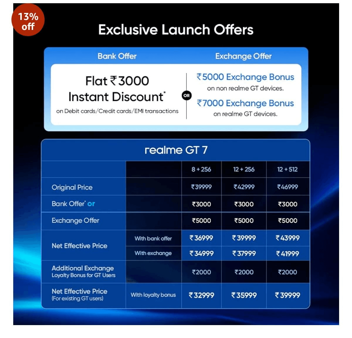 Realme GT 7 को कंपनी ने तीन वेरिएंट्स में लॉन्च किया है. जिसमें पहले वेरिएंट 8GB+256GB की कीमत 39,999 रुपये, दूसरे वेरिएंट 12GB+256GB की कीमत 42,999 रुपये और तीसरे वेरिएंट 12GB+512GB की कीमत 46,999 रुपये है. ऐसे में अमेजन पर आपको बैंक ऑफर दिया जा रहा है. जिसमें आप किसी भी बैंक के क्रेडिट कार्ड से पेमेंट करते हैं तो आपको 3,000 रुपये का इंस्टेंट डिस्काउंट मिलेगा. जिससे GT 7 की शुरुआती कीमत घट कर 36,999 रुपये हो जाएगी.