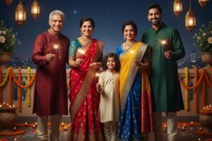 Prompt 3: Create a 4K portrait of a multigenerational Indian family celebrating Diwali at home. Include grandparents seated on a sofa, parents standing nearby, and children interacting joyfully. Everyone wears traditional festive attire — sarees, lehengas, kurtas, and sherwanis — with authentic colors and patterns. Surround them with warm golden diyas, marigold garlands, rangoli, and twinkling fairy lights. Capture genuine smiles, natural interactions, and a cozy festive atmosphere. Ensure warm, soft lighting illuminates all faces clearly and keeps them true to the original references, highlighting the happiness and togetherness of the celebration.