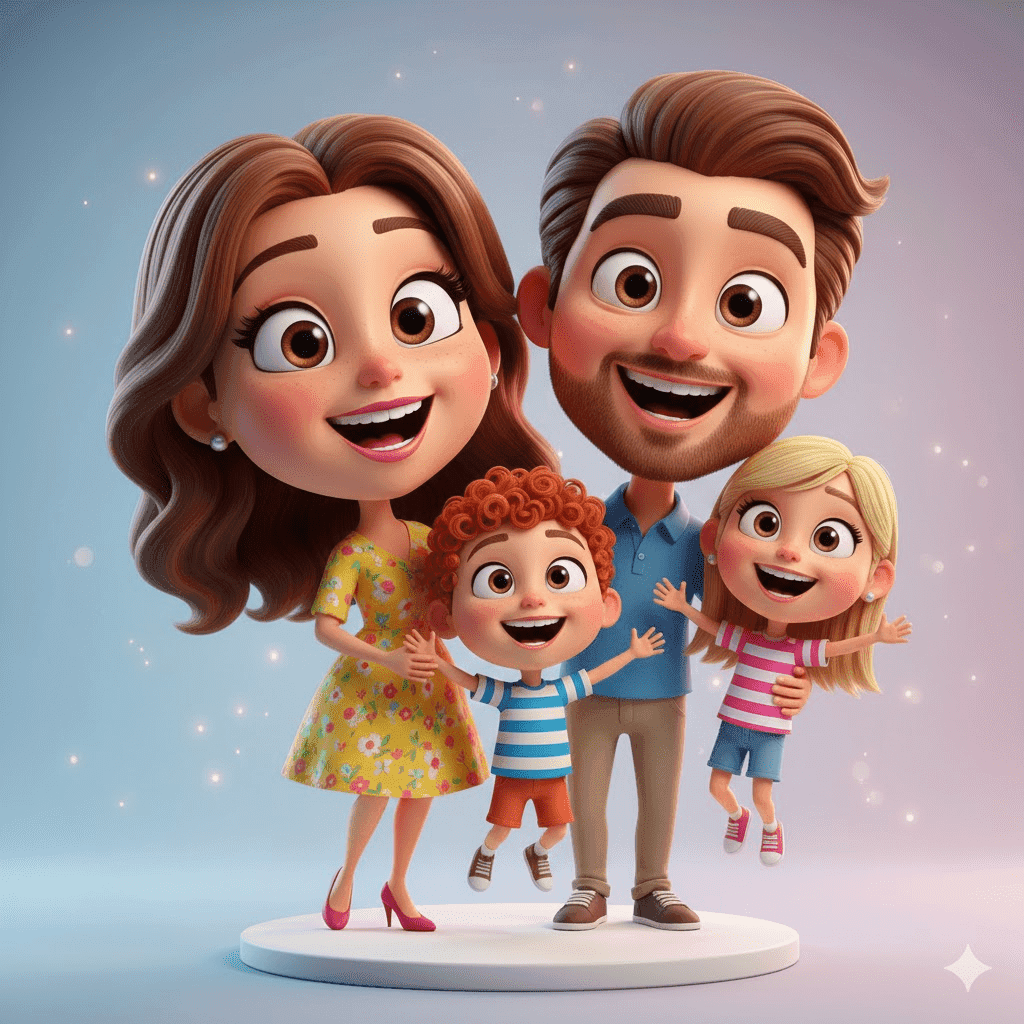 अगर आप अपनी फैमिली के लिए “Create a 3D character version of the uploaded photo in a fun family with an oversized head, joyful expressions, bright colors, and lively energy. Slight exaggeration in eyes and smiles. Cartoon-style clean shading, stylized hair, high detail, wholesome feel.”Rendered in a smooth, polished style with clean materials and soft ambient lighting. Minimal background to emphasize the character’s charm and presence.”