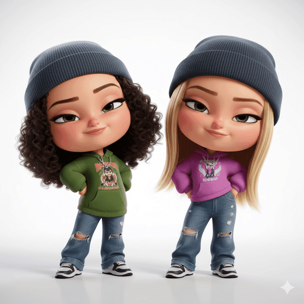 “Create an animated 3D caricature of two female best friends in a style inspired by Boss Baby — large rounded heads, expressive half-lidded eyes, smooth glossy skin, and stylized facial features. Transform them into teenage versions while keeping the cute cartoon proportions. Dress them in stylish outfits like baggy clothes, with confident, sassy poses and playful attitudes. Use clean white background, soft studio lighting, high-detail 3D textures, and polished DreamWorks-style rendering. Capture a fun, bold, mischievous best-friends vibe.”
