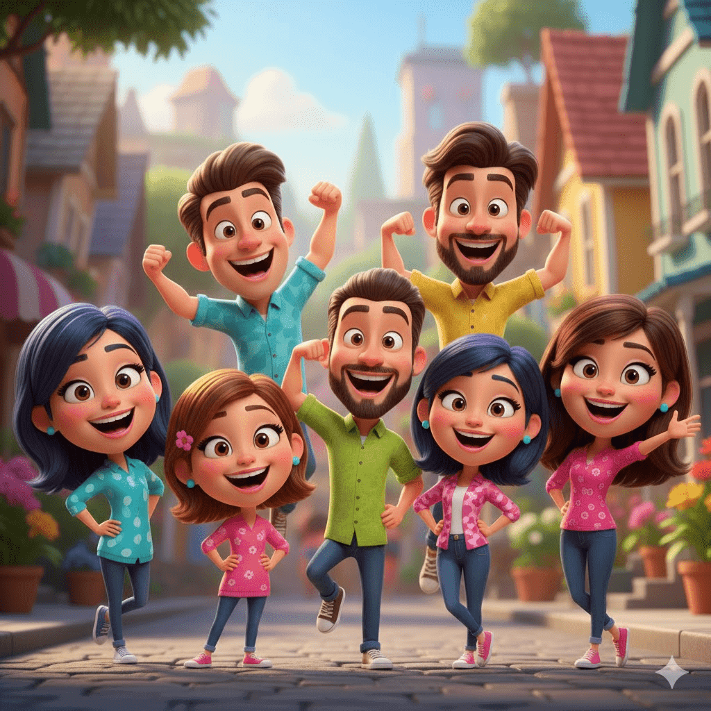 “Create a 3D character version of the uploaded photo of group friends in a colorful Pixar-style look. Exaggerated facial expressions, big expressive eyes, stylized hair, vibrant clothing, and cute cartoon proportions. Capture dynamic, playful poses with lots of energy and personality. Use soft sunlight, bright pastel colors, smooth textures, and polished 3D shading. Background should be a cheerful city street or cartoon neighborhood with warm tones and cinematic depth of field. High-detail, fun, wholesome, energetic group vibe.”