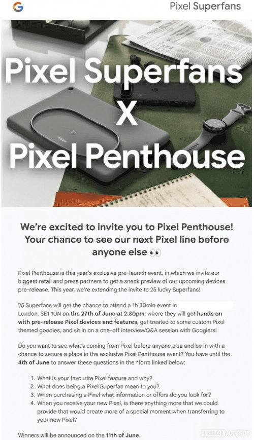 Google Pixel 10 Launch News: गूगल अपने फ्लैगशिप स्मार्टफोन Pixel 10 को इस बार जल्दी लॉन्च करने की तैयारी में है. रिपोर्ट्स के मुताबिक, कंपनी ने अपने Pixel Superfans को 27 जून को लंदन में आयोजित होने वाले Pixel Penthouse इवेंट के लिए इनवाइट भेजा है. इस इवेंट को Pixel 10 के प्री-लॉन्च प्रिव्यू के तौर पर देखा जा रहा है, जिससे इसके जल्द लॉन्च की संभावना और भी बढ़ गई है.