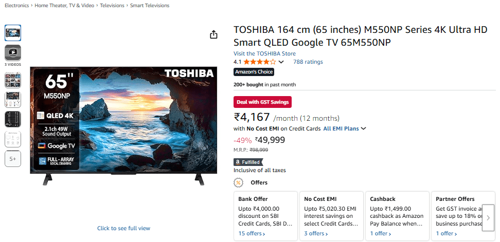 अमेजन सेल में Toshiba के 65 इंच स्मार्ट टीवी पर 49% तक का डिस्काउंट मिल रहा है. जिससे इस स्मार्ट टीवी को 98,999 रुपये की जगह 49,999 रुपये में खरीदा जा सकता है. इसके अलावा अगर आपके पास SBI बैंक का क्रेडिट या डेबिट कार्ड है तो उस पर भी आपको इंस्टेंट बैंक डिस्काउंट मिलेगा. डेबिट कार्ड पर 3500 रुपये तो वहीं क्रेडिट कार्ड पर आपको 5000 रुपये तक की छूट मिलेगी. जिससे इस टीवी को आप और भी सस्ते में खरीद पाएंगे. इस टीवी पर EMI ऑप्शन भी मिलेगा. ऐसे में 4,167 रुपये 12 महीने की EMI पर आप इसे खरीद सकते हैं. फीचर्स कि बात करें तो Toshiba का ये टीवी Google TV है. आप इस टीवी में आराम से YouTube, Netflix, Prime Video जैसे OTT का मजा ले सकेंगे. इस मॉडल में 60Hz रिफ्रेश रेट के साथ 4K रेजोल्यूशन वाली QLED स्क्रीन है. Dolby Atmos के साथ 49W वाले 2 दमदार स्पीकर दिए गए हैं. इसके अलावा इसमें वॉयस कंट्रोल और स्क्रीन शेयरिंग जैसे फीचर्स भी मिलेंगे. इस टीवी में आपको 1 साल की वारंटी मिलेगी.