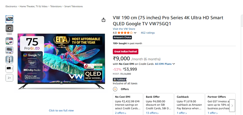 अगर आपको 75 इंच की बड़ी स्क्रीन वाला स्मार्ट टीवी लेना है तो फिर VW 75 inch Pro Series 4K Ultra HD Smart QLED Google TV एक अच्छा ऑप्शन है. इसमें आपको 4K रेजोल्यूशन वाली QLED स्क्रीन मिलेगी. साथ ही Dolby Audio के साथ 48W स्पीकर आउटपुट मिलेगा. अमेजन सेल में इस टीवी पर 53% तक का डिस्काउंट दे रहा है. जिससे आप इसे 1,14,999 रुपये की जगह 53,999 रुपये में खरीद सकेंगे. इसके अलावा इस टीवी पर भी आपको SBI डेबिट/क्रेडिट कार्ड पर 3500 रुपये का बैंक डिस्काउंट मिलेगा. जिससे आप इसे 50,499 रुपये में खरीद सकेंगे. इस टीवी पर 18 महीने की वारंटी मिलेगी.
