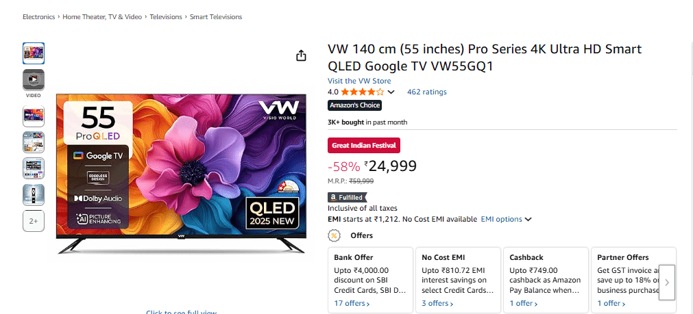 अगर आपको सस्ते में 55 इंच का स्मार्ट टीवी खरीदना है, तो फिर VW का 55 inch Pro Series 4K Ultra HD Smart QLED Google TV परफेक्ट रहेगा. अमेजन सेल में इस मॉडल पर 58% तक का डिस्काउंट मिल रहा है. जिससे आप इस टीवी को 59,999 रुपये की जगह 24,999 रुपये में खरीद सकेंगे. इसके अलावा अगर आप के पास SBI बैंक का डेबिट कार्ड है, तो आपको 2000 रुपये का डिस्काउंट मिलेगा. जिससे आप इस टीवी को 22,999 रुपये में खरीद सकेंगे. वहीं, अगर आपके पास SBI बैंक का क्रेडिट कार्ड है, तो आपको 3,500 रुपये का बैंक डिस्काउंट मिलेगा. जिससे आपको सिर्फ 21,499 रुपये में ये मॉडल मिल जाएगा. फीचर्स कि बात करें तो, इस में 60Hz रिफ्रेश रेट के साथ 4K रेजोल्यूशन वाली QLED स्क्रीन है. इस टीवी में YouTube, Zee5, JioHotstar आप आराम से देख सकेंगे. Dolby Atmos के साथ 30W का स्पीकर, 3 HDMI पॉर्ट्स और 2 USB पॉर्ट्स दिए गए हैं. इस टीवी में आपको 18 महीने की वारंटी मिलेगी.