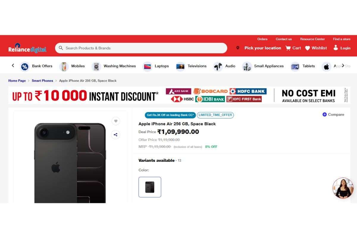 Reliance Digital पर इस समय iPhone Air की कीमत कम कर दी गई है. तीनों स्टोरेज वेरिएंट अपने लॉन्च प्राइस से कम रेट पर मिल रहे हैं. 256GB वाला बेस मॉडल, जिसकी कीमत पहले 1,19,900 रुपये थी, अब 1,09,900 रुपये में मिल रहा है. यानी सीधा 10,000 रुपये का फायदा आपको मिल रहा है.