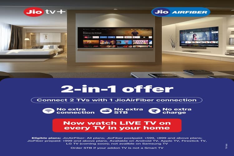 Jio 2 in 1 Offer: रिलायंस जियो (Reliance Jio) ने जियो टीवी प्लस (Jio TV+) टू इन वन ऑफर पेश किया है. इस ऑफर के तहत ग्राहक अब एक ही जियो एयर फाइबर (Jio Air Fiber) कनेक्शन से दो टीवी एक साथ चला सकते हैं.