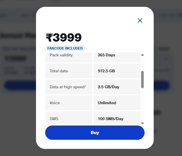 Jio का 3999 रुपये वाला प्लान भी कंपनी के 3599 रुपये वाले प्लान की तरह है. इस प्लान में भी 365 दिन की वैलिडिटी, किसी भी नेटवर्क पर अनलिमिटेड कॉलिंग, हर दिन 100 फ्री SMS और डेली 2.5GB डेटा (5G यूजर्स के लिए अनलिमिटेड डेटा) का फायदा मिलेगा. इस प्लान में भी 3599 रुपये वाले प्लान की तरह ही बेनिफिट्स भी मिलेंगे. हालांकि, इसमें FanCode का फ्री सब्सक्रिप्शन भी अलग से मिलेगा.
