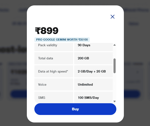 अन्य बेनिफिट्स कि बात करें, तो जियो के 899 रुपये वाले प्लान में कंपनी यूजर्स को 3 महीने के लिए फ्री JioHotstar का मोबाइल सब्सक्रिप्शन, 2 महीने के लिए फ्री JioHome का ट्रायल, JioGold पर 2% तक का बोनस, JioTV का फ्री एक्सेस, 50GB फ्री JioAICloud का एक्सेस और तो और 18 महीने के लिए फ्री Gemini का सब्सक्रिप्शन दे रही है.