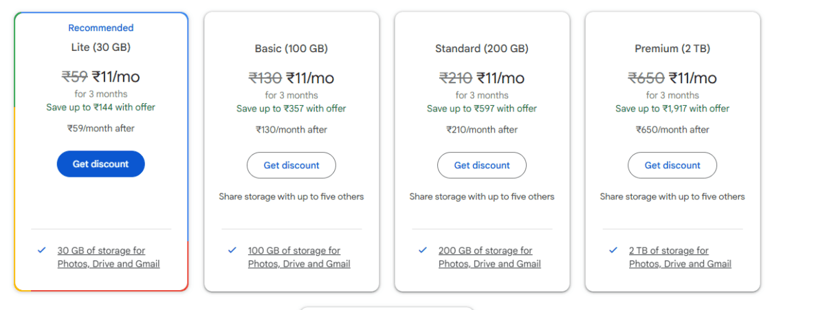 Google One में यूजर्स को चार क्लाउड स्टोरेज प्लान ऑप्शन मिलते हैं. जिसमें 59 रुपये में 30GB वाला Lite प्लान, 130 रुपये में 100GB वाला बेसिक प्लान, 210 रुपये में 200GB वाला स्टैंडर्ड प्लान और 650 रुपये में 2TB वाला प्रीमियम प्लान ऑप्शन शामिल है. लेकिन डिस्काउंट ऑफर के तहत आप इन सभी प्लान्स को सिर्फ 11 रुपये में खरीद सकते हैं. 11 रुपये में आपको 3 महीने तक का Google क्लाउड स्टोरेज मिलेगा. हालांकि, 3 महीने की वैलिडिटी खत्म होने के बाद आपको क्लाउड स्टोरेज के ऑरिजिनल प्लान की कीमत ही देनी होगी. यानी कि प्लान के हिसाब से आपको 59 रुपये, 130 रुपये, 210 रुपये या फिर 650 रुपये हर महीने देने पड़ेंगे.