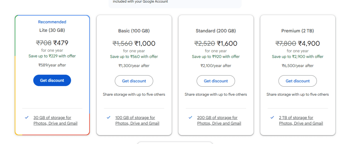 अगर आप एनुअल प्लान्स खरीदना चाहते हैं, तो आपको एनुअल क्लाउड स्टोरेज प्लान्स पर भी डिस्काउंट मिलेगा. जिससे आप 708 रुपये में 30GB स्टोरेज वाले Lite प्लान को सिर्फ 479 रुपये में खरीद सकते हैं. वहीं, 1560 रुपये में 100GB स्टोरेज वाले बेसिक प्लान को 1000 रुपये में, 2520 रुपये में 200GB स्टोरेज वाले स्टैंडर्ड प्लान को 1600 रुपये में और 7800 रुपये वाले 2TB स्टोरेज वाले प्रीमियम प्लान को 4,900 रुपये में खरीद सकते हैं.