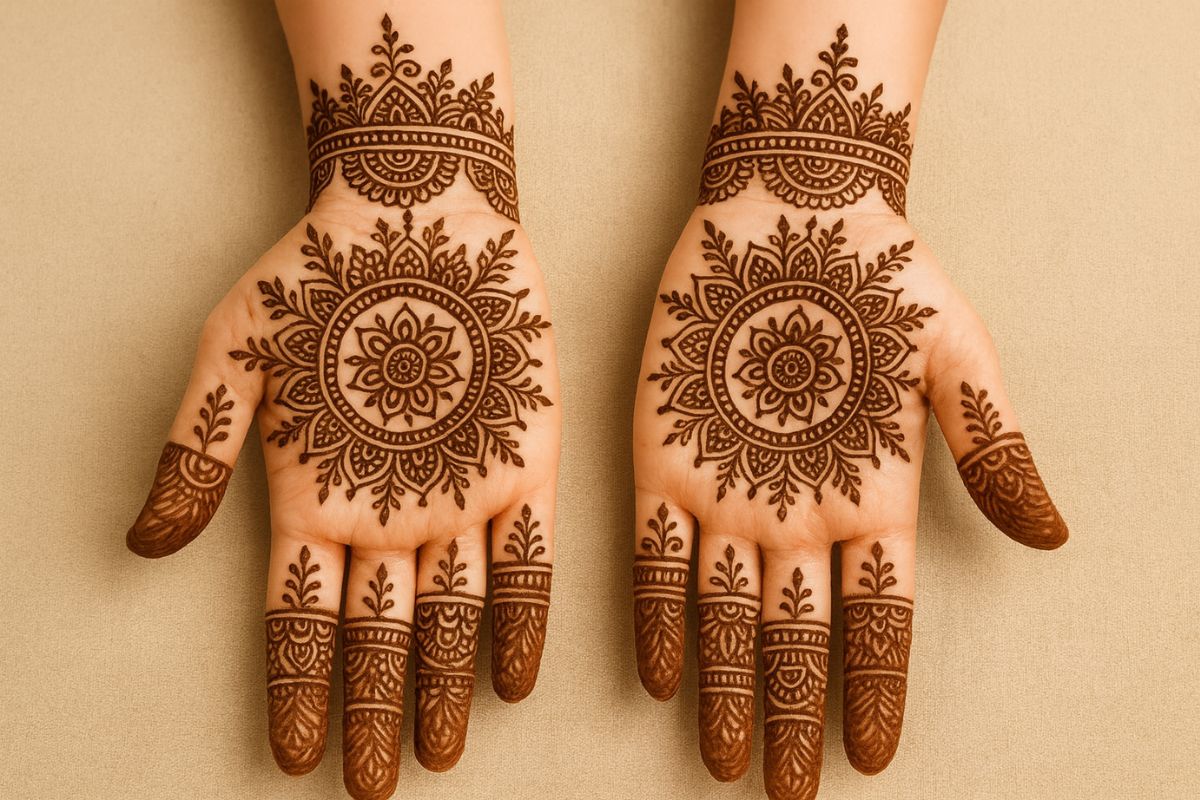 यह एआई मेहंदी डिजाइन दोनों हथेलियों पर बने सिमेट्रिकल मंडला पैटर्न के साथ बेहद सुंदर और क्लासिक लुक देता है. बारीक लाइन वर्क, गोल फ्लोरल डिटेलिंग और फुल फिंगर फिल डिजाइन इसे शादी, त्योहार और खास मौकों के लिए परफेक्ट बनाते हैं.