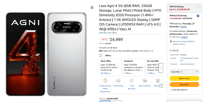 Lava के ऑफिशियल साइट के अलावा यह नया मॉडल ई-कॉमर्स शॉपिंग साइट Amazon पर उपलब्ध है. इस मॉडल को कंपनी ने बस एक ही वेरिएंट 8GB+256GB में लॉन्च किया है. कीमत कि बात करें, तो यह मॉडल अमेजन पर 24,999 रुपये में लिस्टेड है. हालांकि, इस मॉडल पर आपको 2000 रुपये का इंस्टेंट बैंक डिस्काउंट दिया जा रहा है, जिससे आप किसी भी बैंक क्रेडिट कार्ड से इस ऑफर का फायदा उठा सकते हैं. ऐसे में बैंक डिस्काउंट के साथ आप Lava Agni 4 को सिर्फ 22,999 रुपये में खरीद सकते हैं.