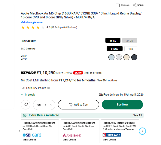 MacBook Air M5 के बेस वेरिएंट (16GB RAM और 512GB स्टोरेज) की कीमत ₹1,19,900 है. Vijay Sales पर इस पर करीब 8% का सीधा डिस्काउंट मिल रहा है, जिससे कीमत घटकर ₹1,10,290 रह जाती है. इसके अलावा, ICICI, SBI और Axis बैंक क्रेडिट कार्ड पर ₹7,000 तक का इंस्टेंट बैंक डिस्काउंट भी मिल रहा है, जिससे इस मॉडल की कीमत और घटकर 1,03,290 रुपये तक हो जाएगी. ऐसे में इस सारे ऑफर्स को मिलाकर आप लगभग ₹16,000 तक की बचत कर सकते हैं.