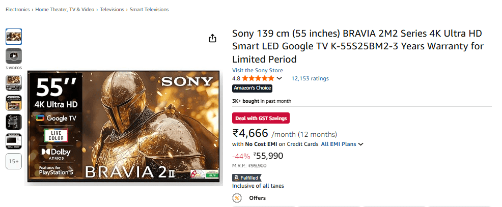 बेहतरीन परफॉर्मेंस और अच्छी डिस्प्ले क्वालिटी के लिए Sony की BRAVIA 2M2 Series अच्छा ऑप्शन है. अमेजन सेल में इस स्मार्ट टीवी पर 44% तक की छूट मिल रही है. जिससे आप इस टीवी को 99,900 रुपये की जगह 55,990 रुपये में खरीद सकेंगे. इसके अलावा आप अगर SBI क्रेडिट कार्ड से पेमेंट करते हैं, तो आपको 5,750 रुपये और डेबिट कार्ड पर 5000 रुपये का बैंक डिस्काउंट भी मिलेगा. जिससे आप इस टीवी को सस्ते में खरीद सकते हैं. इस स्मार्ट टीवी में आपको 60Hz रिफ्रेश रेट और 4K UHD Resolution मिलेगा. कनेक्टिविटी के लिए 4 HDMI Ports मिलेंगे. 20W का साउंड आउट्पुट भी मिलेगा. इसके अलावा इस टीवी पर आपको 3 साल की वारंटी भी मिलेगी.