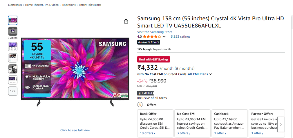 अमेजन के ग्रेट इंडियन फेस्टिवल सेल में Samsung का 55 inch Crystal 4K Vista Pro Ultra HD Smart LED TV अच्छा ऑप्शन है. इस टीवी पर अमेजन 34% तक का डिस्काउंट दे रही है. जिससे इस स्मार्ट टीवी की कीमत 38,990 रुपये हो जाएगी. इसके अलावा इस टीवी पर भी SBI क्रेडिट कार्ड पर 5250 रुपये और डेबिट कार्ड पर 2000 रुपये का डिस्काउंट मिल रहा है. जिससे आप इसे सस्ते में खरीद सकेंगे. Samsung के इस 55 इंच LED स्मार्ट टीवी में 4K UHD Resolution और 50Hz रिफ्रेश रेट मिलेगा. कनेक्टिविटी के लिए 3 HDMI Ports, WiFi5, Bluetooth 5.2 फीचर्स मिलेंगे. इस टीवी में 20W का साउंड आउट्पुट भी मिलेगा. इसके अलावा इस टीवी पर आपको 1 साल की वारंटी भी मिलेगी.