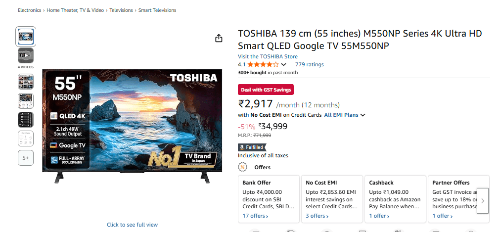 55 इंच के स्मार्ट टीवी के लिए TOSHIBA भी एक अच्छा ऑप्शन है. ऐसे में आप अमेजन के सेल से TOSHIBA का M550NP Series 4K Ultra HD Smart QLED Google TV ले सकते हैं. अमेजन सेल में इस टीवी पर 49% तक की छूट मिल रही है. जिससे आप इस स्मार्ट टीवी को 71,999 रुपये की जगह 34,999 रुपये में खरीद सकेंगे. वहीं, SBI क्रेडिट कार्ड पर 4,500 रुपये और डेबिट कार्ड पर 2000 रुपये का बैंक डिस्काउंट मिलेगा. जिससे आप इस टीवी को सस्ते में खरीद सकेंगे. TOSHIBA के इस टीवी में आपको QLED 4K UHD Resolution और 120Hz रिफ्रेश रेट मिलेगा. कनेक्टिविटी के लिए 3 HDMI Ports, WiFi, Bluetooth 5.0 फीचर्स मिलेंगे. इस टीवी में Dolby Atmos सपोर्ट के साथ 49W का दमदार साउंड आउट्पुट भी मिलेगा. यह Google TV है. साथ ही इस टीवी में आप Netflix से लेकर कई सारे OTT ऐप्स का मजा ले सकते हैं. इसके अलावा इस टीवी पर आपको 1 साल की वारंटी भी मिलेगी.