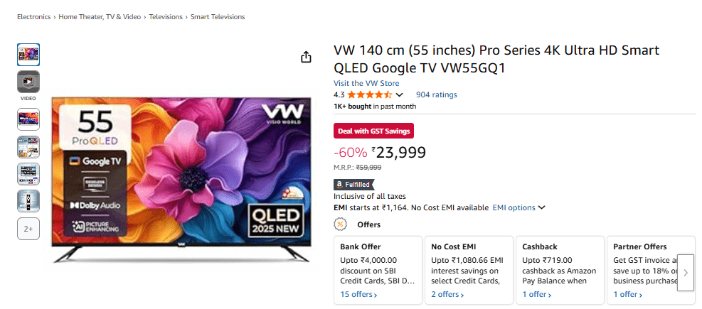 VW 55-इंच Pro सीरीज 4K Ultra HD स्मार्ट QLED Google TV अमेजन सेल में 60% की भारी छूट पर उपलब्ध है. जिससे इस टीवी की कीमत 59,999 रुपये से घटकर 23,999 रुपये हो गई है. इसके अलावा SBI क्रेडिट कार्ड पर 2000 रुपये और डेबिट कार्ड पर 1500 रुपये का बैंक डिस्काउंट मिलेगा. जिससे आप इस स्मार्ट टीवी को सस्ते में खरीद सकेंगे. इस टीवी में HDR10 के साथ बेजल-लेस QLED 4K पैनल है, जो 60Hz रिफ्रेश रेट है, जो बेहतरीन व्यूईंग एक्सपीरियंस देगा. इसके साथ ही इस टीवी में Dolby Atmos सपोर्ट के साथ 30W साउंड सिस्टम, Google TV, वॉयस असिस्टेंट रिमोट और कई कनेक्टिविटी ऑप्शनस मिलेंगे.