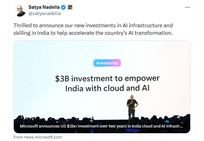 Microsoft invest 3 Billion USD in India AI Cloud services
