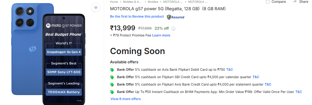 ऑफिशियल साइट के अलावा कंपनी ने इस मॉडल को ई-कॉमर्स शॉपिंग साइट Flipkart पर लॉन्च किया है. Moto G57 Power को कंपनी ने सिर्फ एक ही वेरिएंट 8GB+128GB ऑप्शन में लॉन्च किया है. कीमत कि बात करें, तो फ्लिपकार्ट पर इस मॉडल की कीमत 13,999 रुपये है. वहीं, लॉन्च होते ही इस पर फ्लिपकार्ट Axis और SBI बैंक क्रेडिट कार्ड पर 1000 रुपये का डिस्काउंट ऑफर दे रहा है, जिससे आप इस मॉडल को 12,999 रुपये में खरीद सकेंगे.