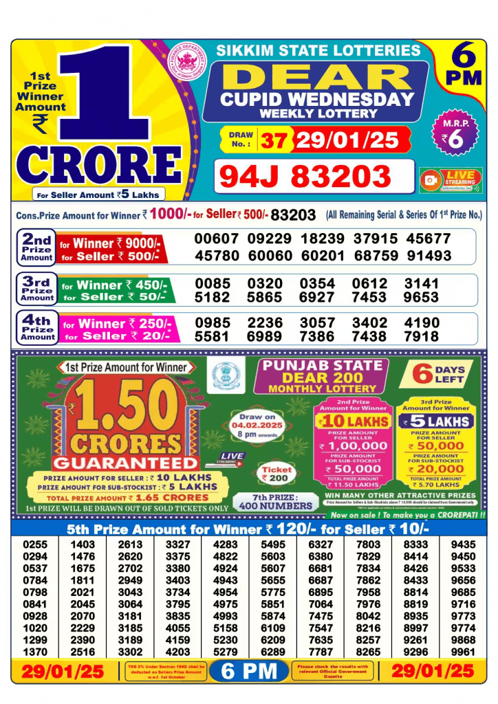 नागालैंड लॉटरी संबाद परिणाम बुधवार 29.01.2025 समय