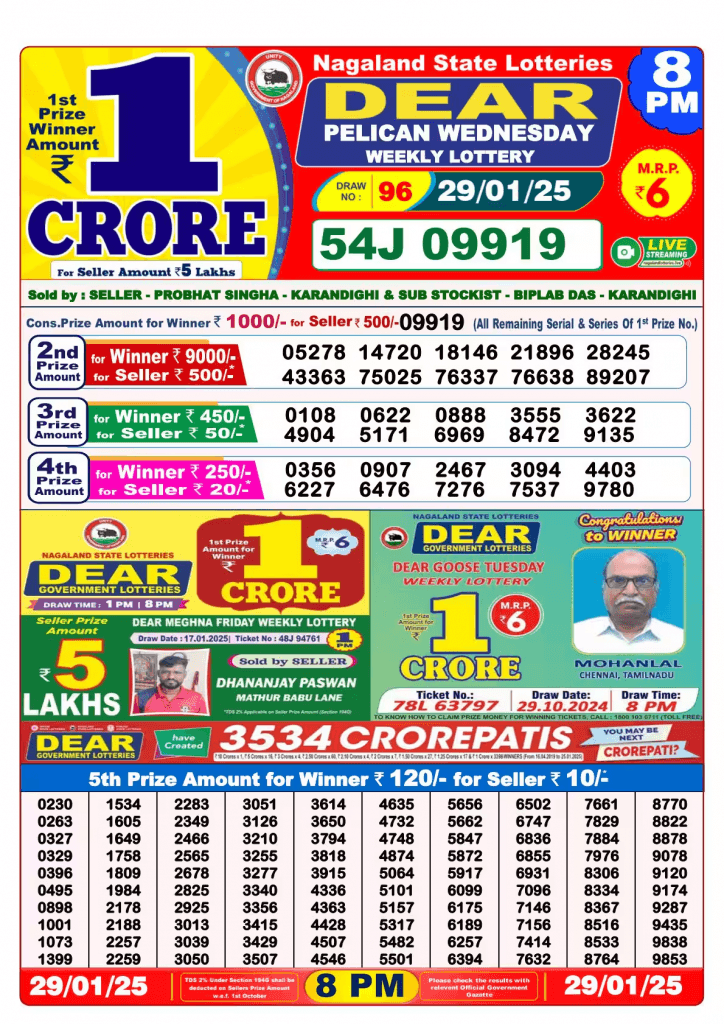 नागालैंड लॉटरी 29-01-2025 बुधवार पुरस्कार राशि विवरण