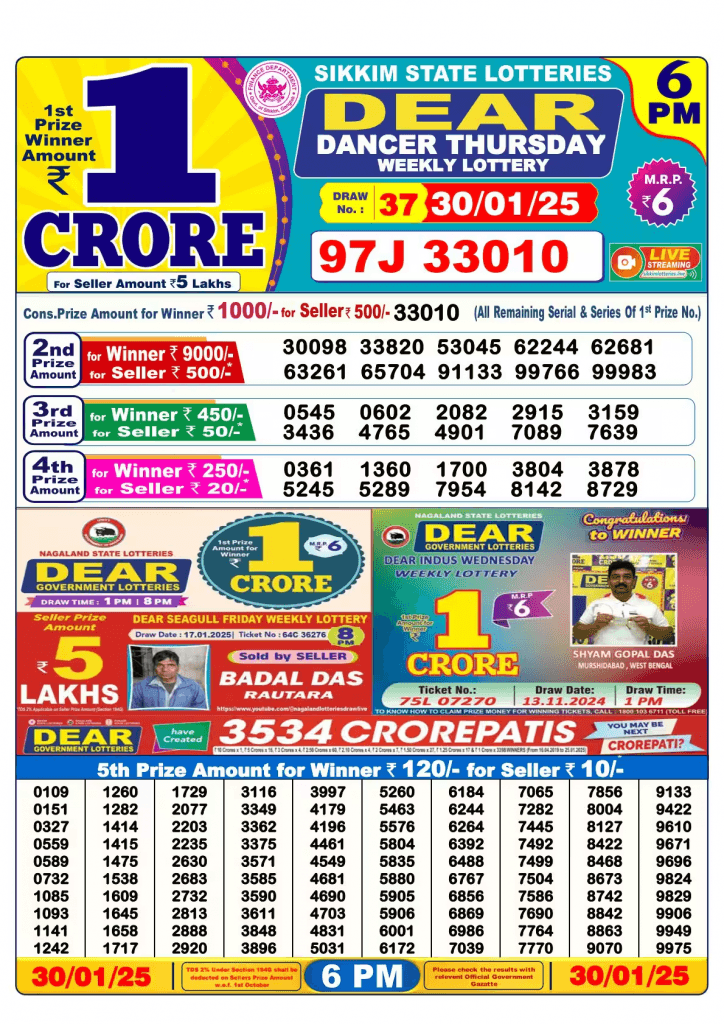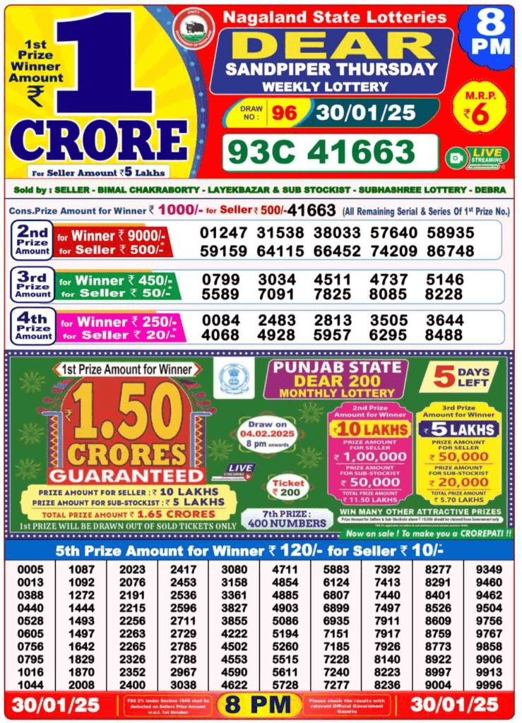 Nagaland Dear Sandpiper 8 PM Lottery Result: 30 जनवरी 2025 को नागालैंड स्टेट लॉटरी के तीन लकी ड्रॉ के परिणाम घोषित किये गए. ये परिणाम क्रमशः DEAR MAHANADI MORNING (1 PM), DEAR DANCER EVENING (6 PM) और DEAR SANDPIPER NIGHT (8 PM) पर आए. इन लॉटरी में पहला पुरस्कार 1 करोड़ रुपये का बंपर है. विजेताओं की सूची नीचे देखें.