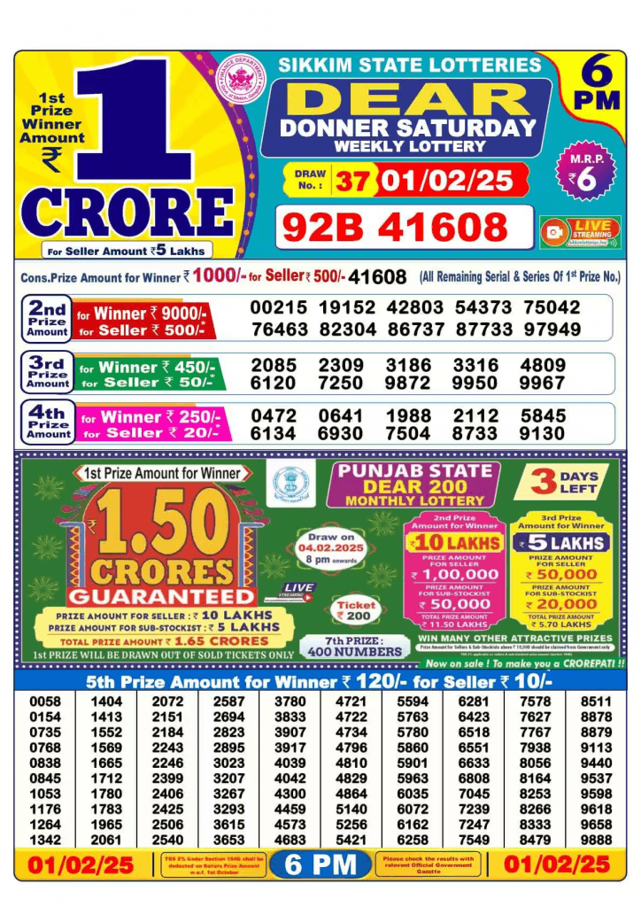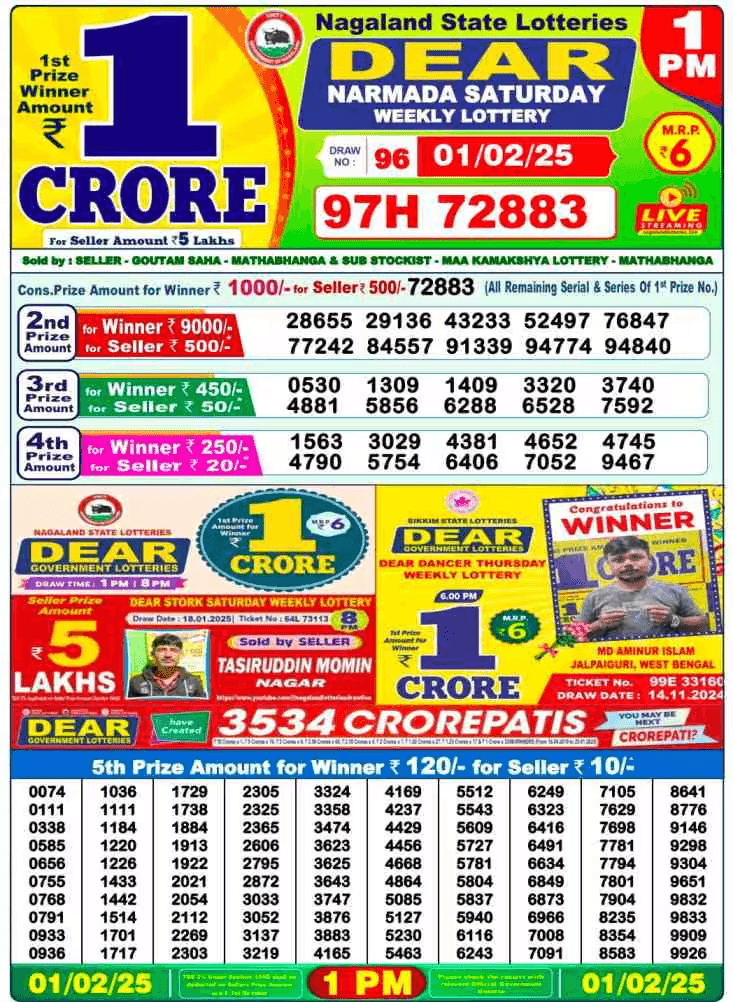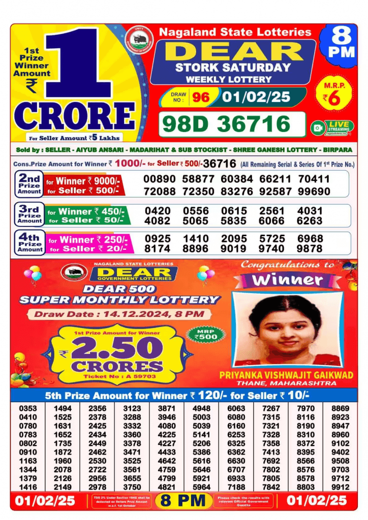 नागालैंड लॉटरी 01-02-2025 शनिवार पुरस्कार राशि विवरण